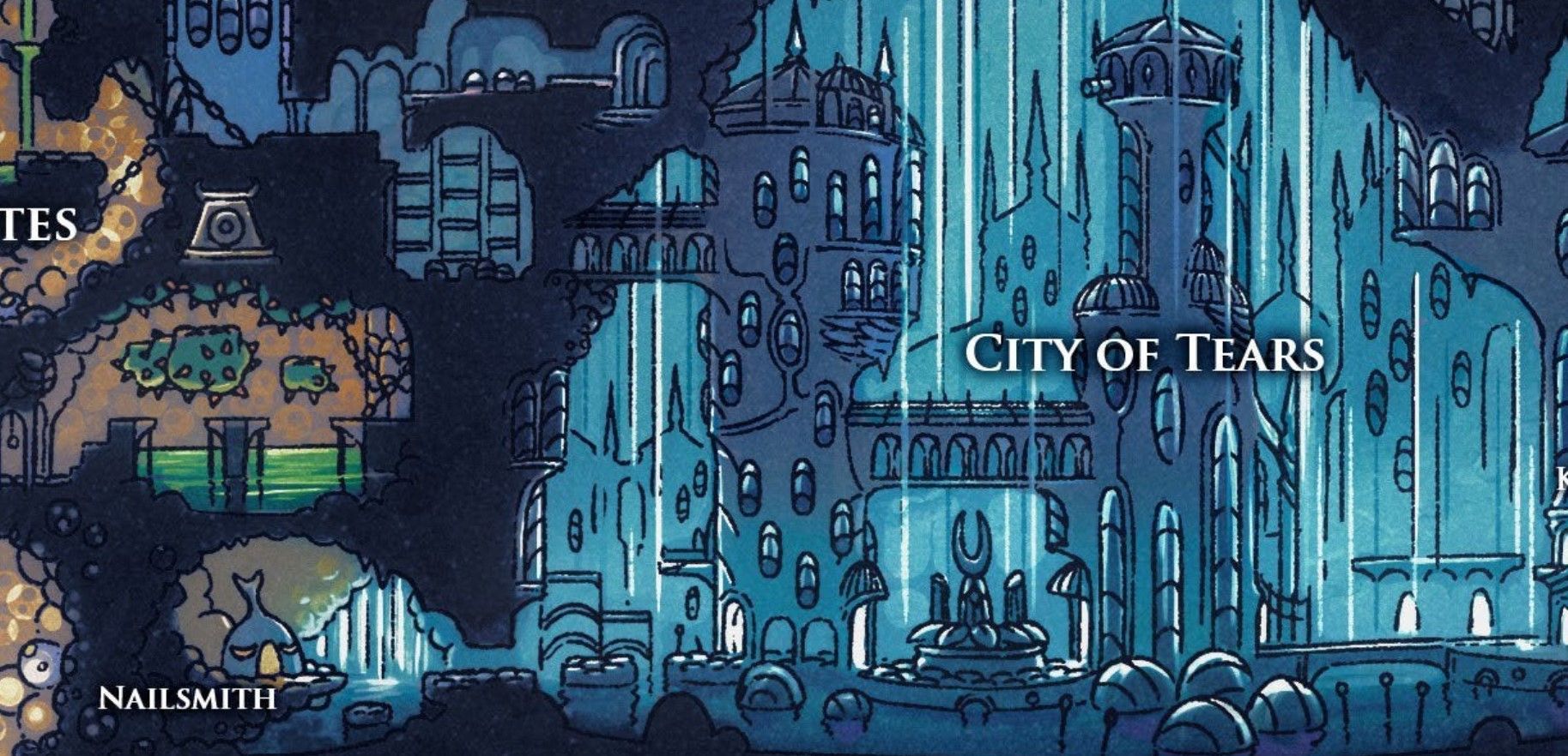 The first thing to do is to figure out where the Nailsmith is so they can upgrade your nail for you. If you go down and a little to the right of Forgotten Crossroads, the first section of the Hallownest Kingdom, you will wander into the City of Tears.